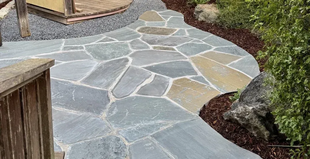 This project is a perfect example of how proper design can allow for an efficient use of a small space. This backyard provides cut flowers, a sweet flagstone patio for seating, and two raised beds for growing vegetables.
